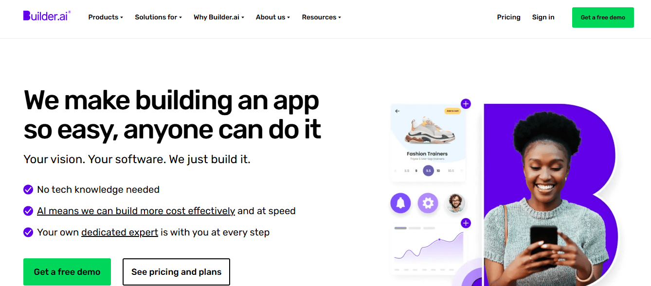 Builder.ai is an AI-powered platform that enables users to create custom software applications without extensive technical expertise. It streamlines the app development process, offering transparent pricing and clear timelines using a library of over 500 reusable feature. This approach makes it accessible for businesses aiming to develop tailored solutions efficiently.