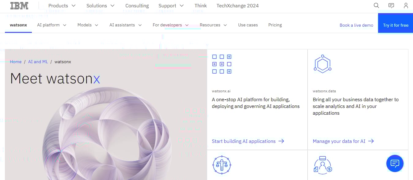IBM Watsonx is an advanced AI platform developed by IBM and is renowned for its NLP and machine learning capabilities. The suite provides AI and data solutions and a portfolio of AI-powered assistants. Watsonx has the following products:
