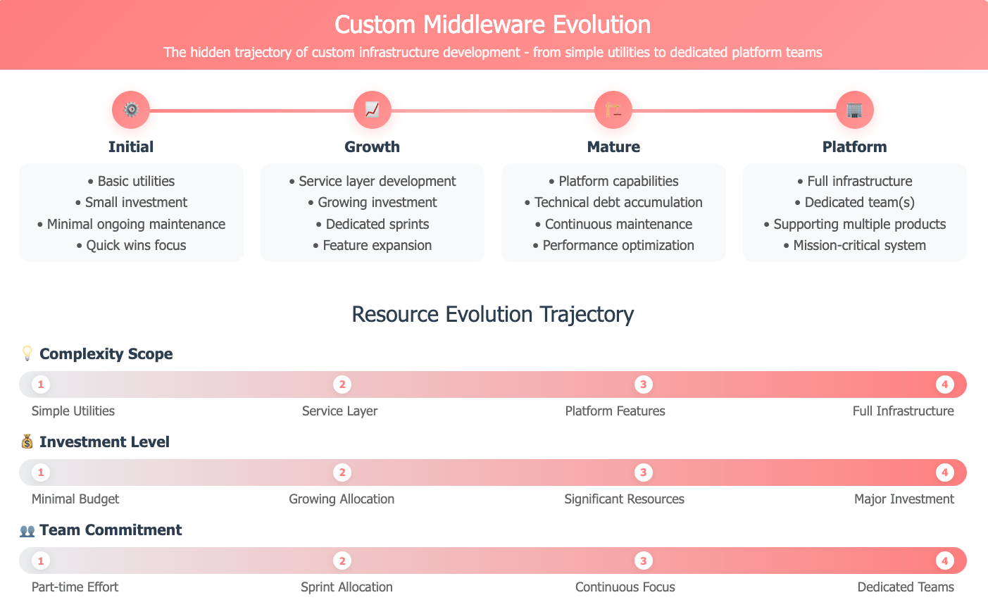 Custom Middleware considerations: Infrastructure sprints displacing product feature work, continuous maintenance burden, slowing release velocity, infrastructure hiring needs, effective lock-in due to engineering opportunity cost.