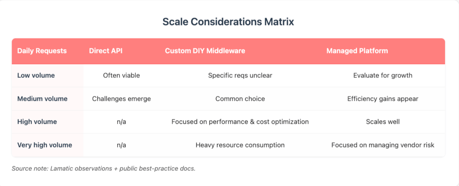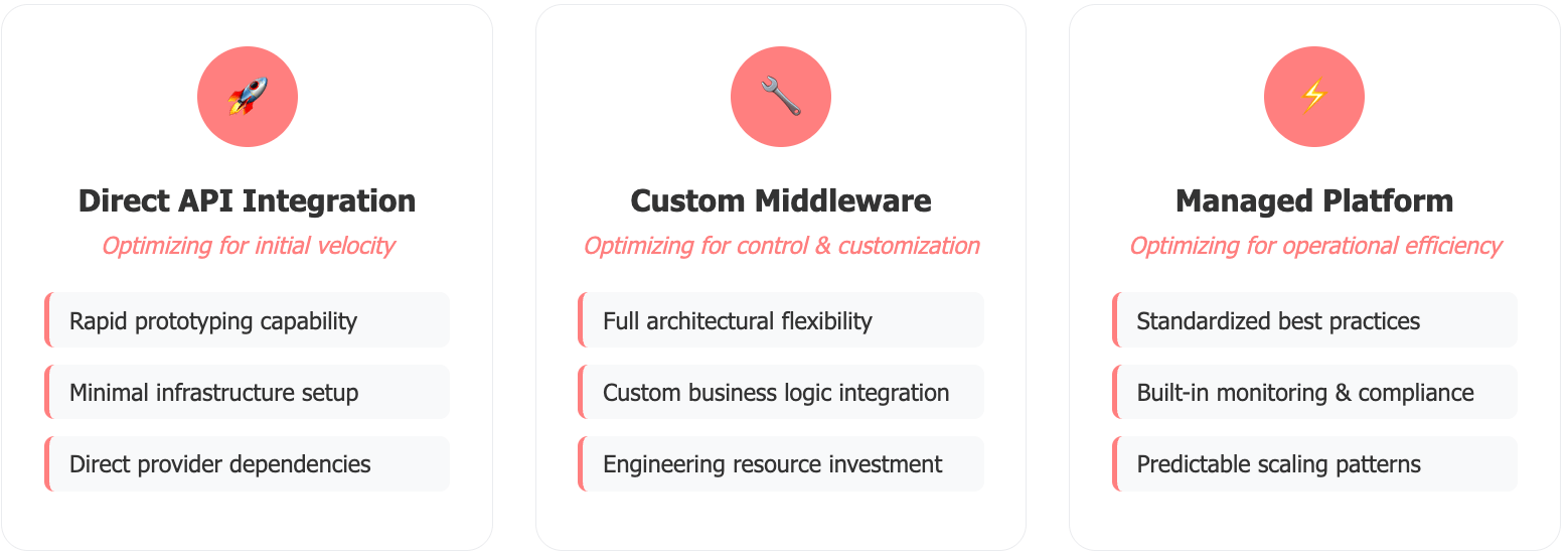 Meta Description: AI infrastructure framework analyzing how teams choose between direct API integration, custom middleware, and managed platforms—with patterns and trade-offs.