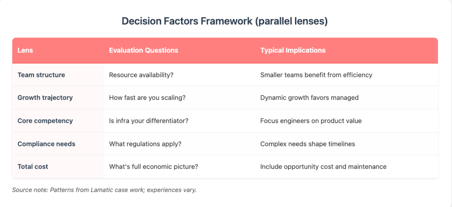 Decide by team structure, scale trajectory, compliance needs, and plumbing vs product focus