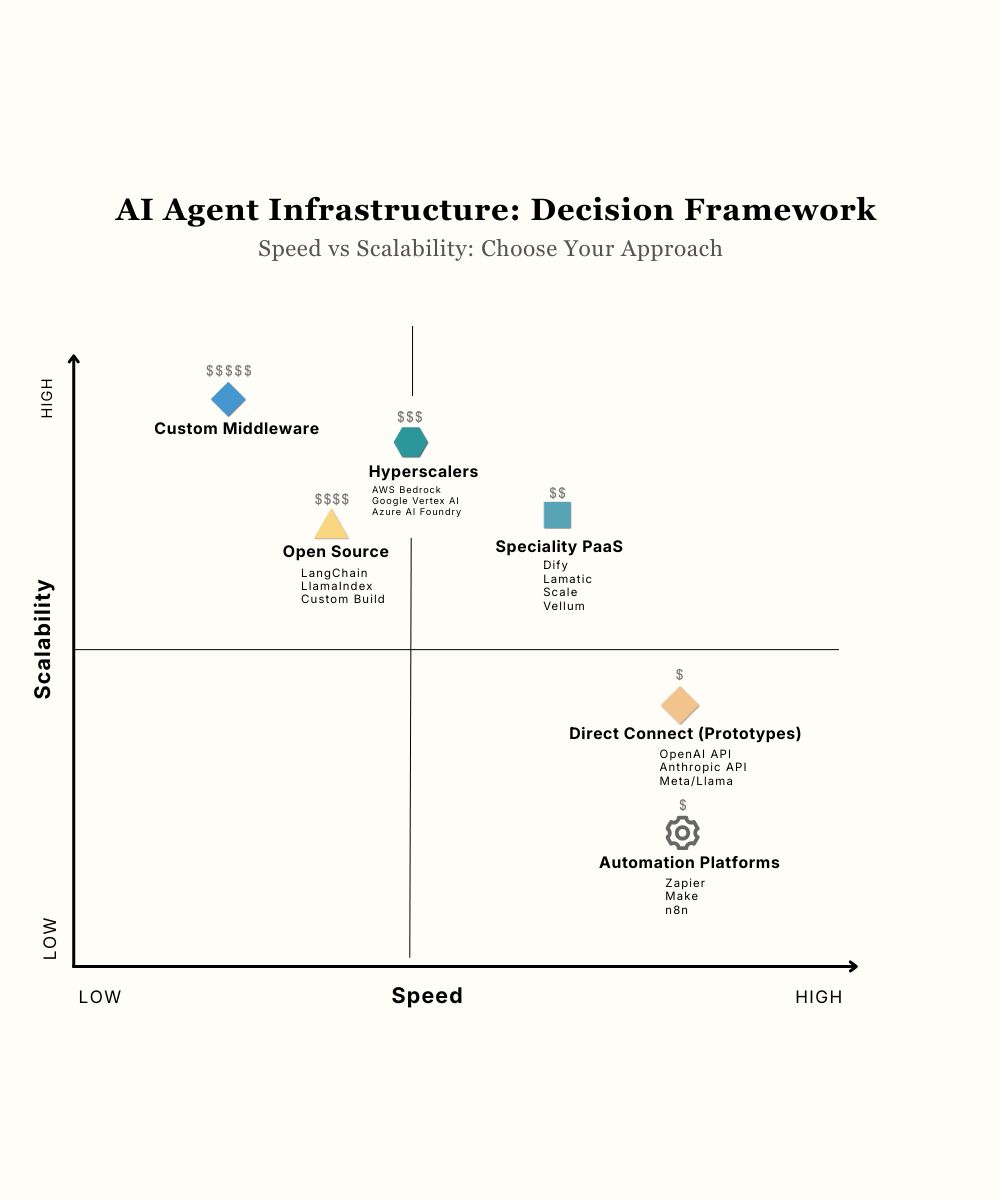 Figure: AI Infrastructure Landscape—Solutions are positioned according to their speed-to-market (X-axis) and scalability (Y-axis) to illustrate the trade-off between speed and architectural extensibility.