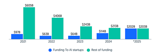 Massive capital concentration: By late 2025, startups labelled “AI” had attracted roughly $200 billion in venture funding — more than any other sector. In Q3 2025 alone, AI deals accounted for 53% of VC dollars, and a very large share of that money went to a handful of “megadeals” (Anthropic raising ~$13B, xAI ~$10B).